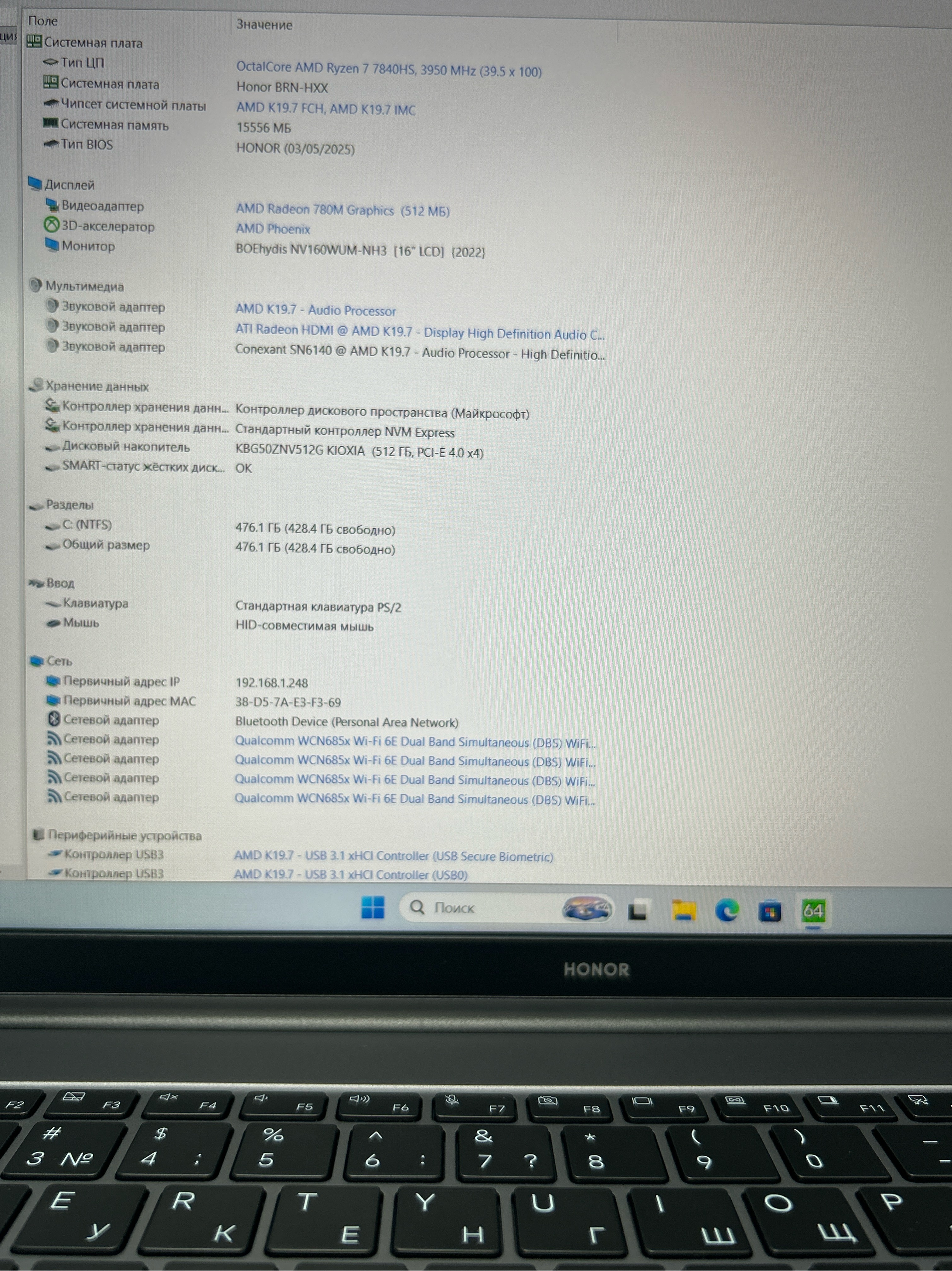 Ноутбук HONOR MagicBook X 16 Pro (5301AGXP) 16"/AMD Ryzen 7 7840HS/RAM 16GB/SSD 512GB/AMD Radeon 780M Graphics/1920x1200/IPS/Windows 11/Подсветка кл-ры: LED/серый космос. Состояние: A1