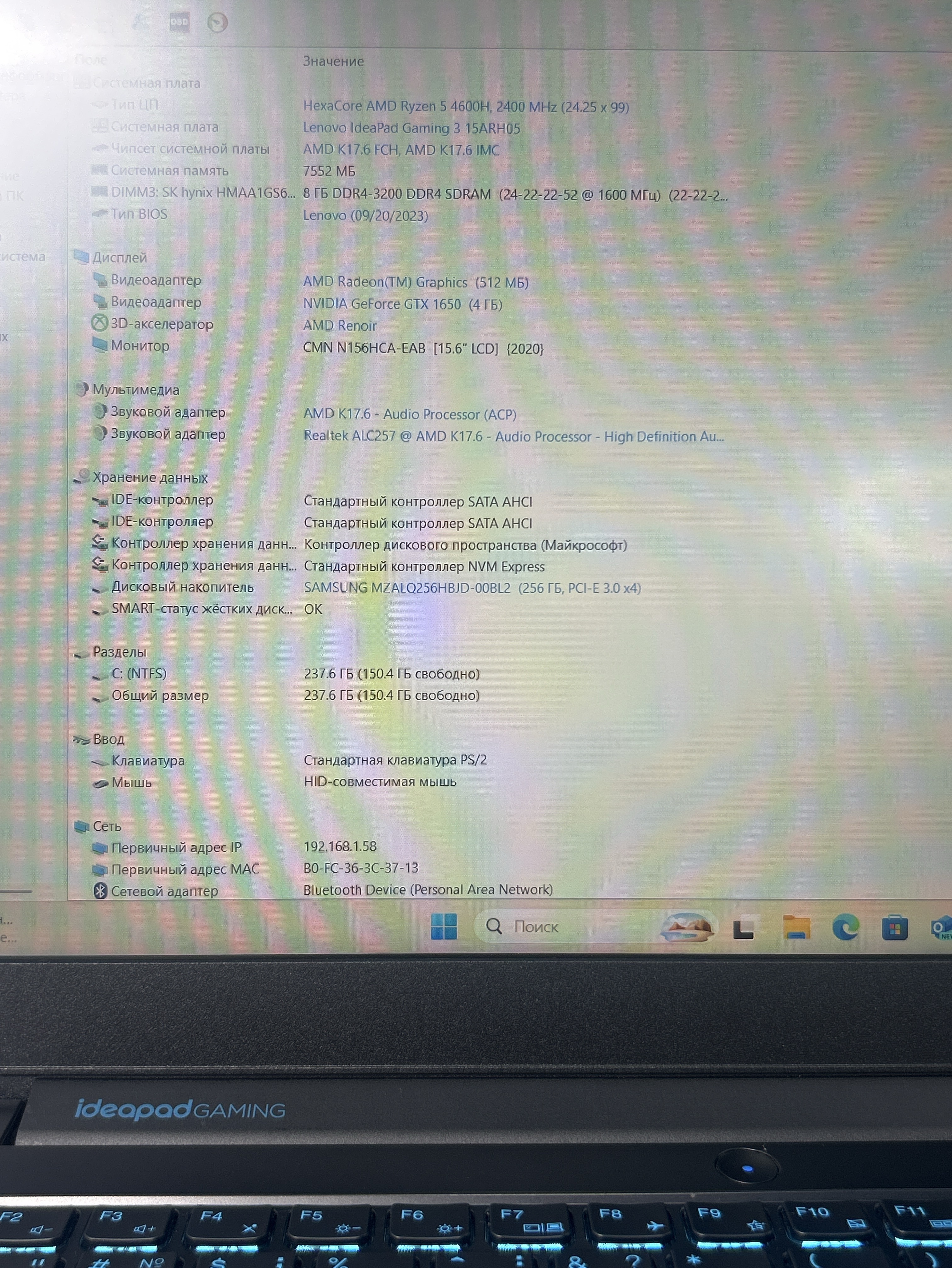 Ноутбук игровой Lenovo IP Gaming 3 15ARH05 (82EY009HRK) 15.6"/AMD Ryzen 5 4600H/RAM 8GB DDR4/256GB SSD/NVIDIA GeForce GTX 1650 4GB/1920х1080/IPS/DOS/Подсветка кл-ры: LED/Цвет черный. Состояние: C1