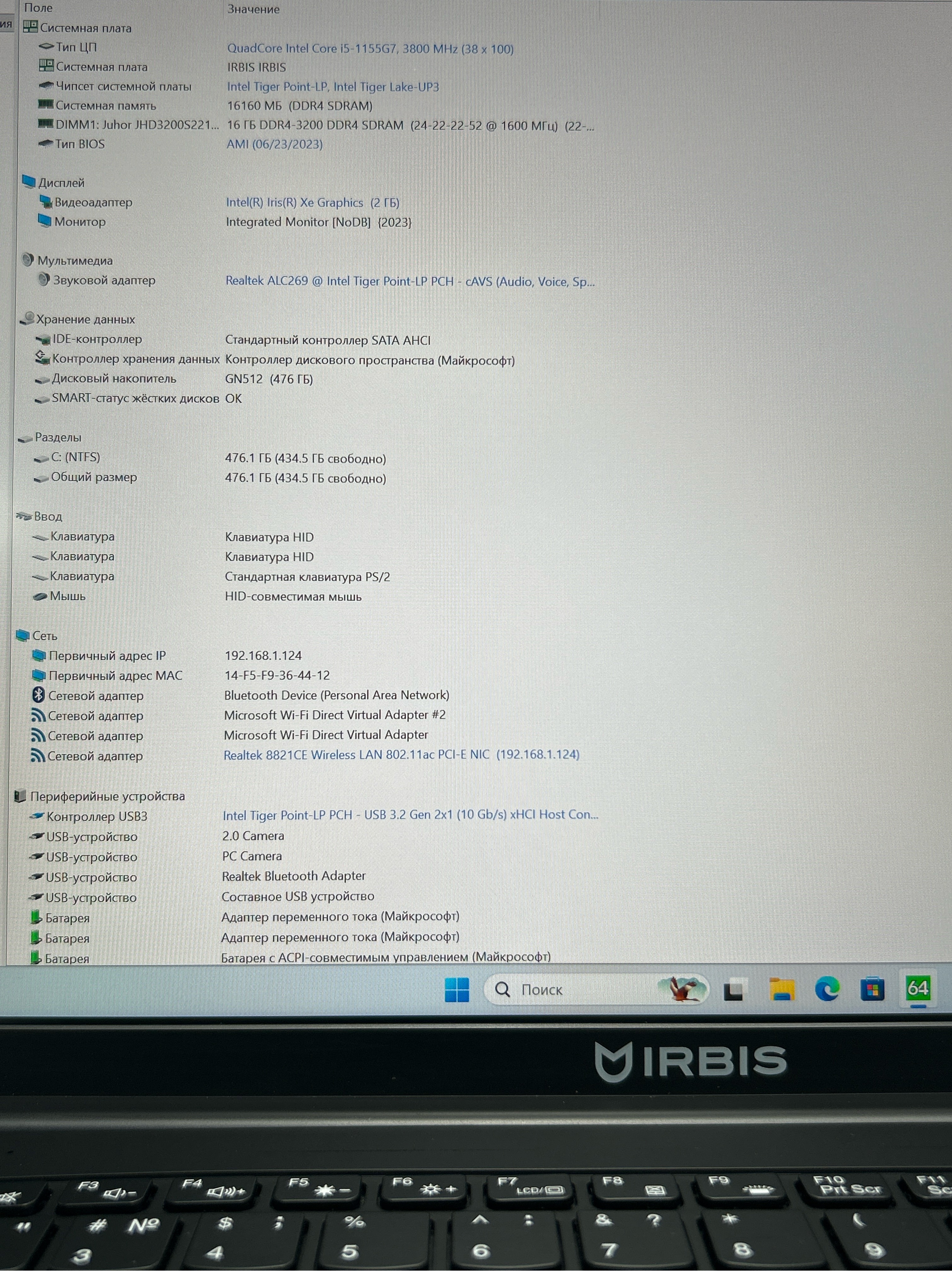 Ноутбук Irbis (16NBC1500) 15.9"/Intel Core i5-1155G7/RAM 16GB/SSD 512GB/Intel Iris Xe Graphics/2560x1600/IPS/Windows 11/Подсветка кл-ры: LED/черный. Состояние: B2