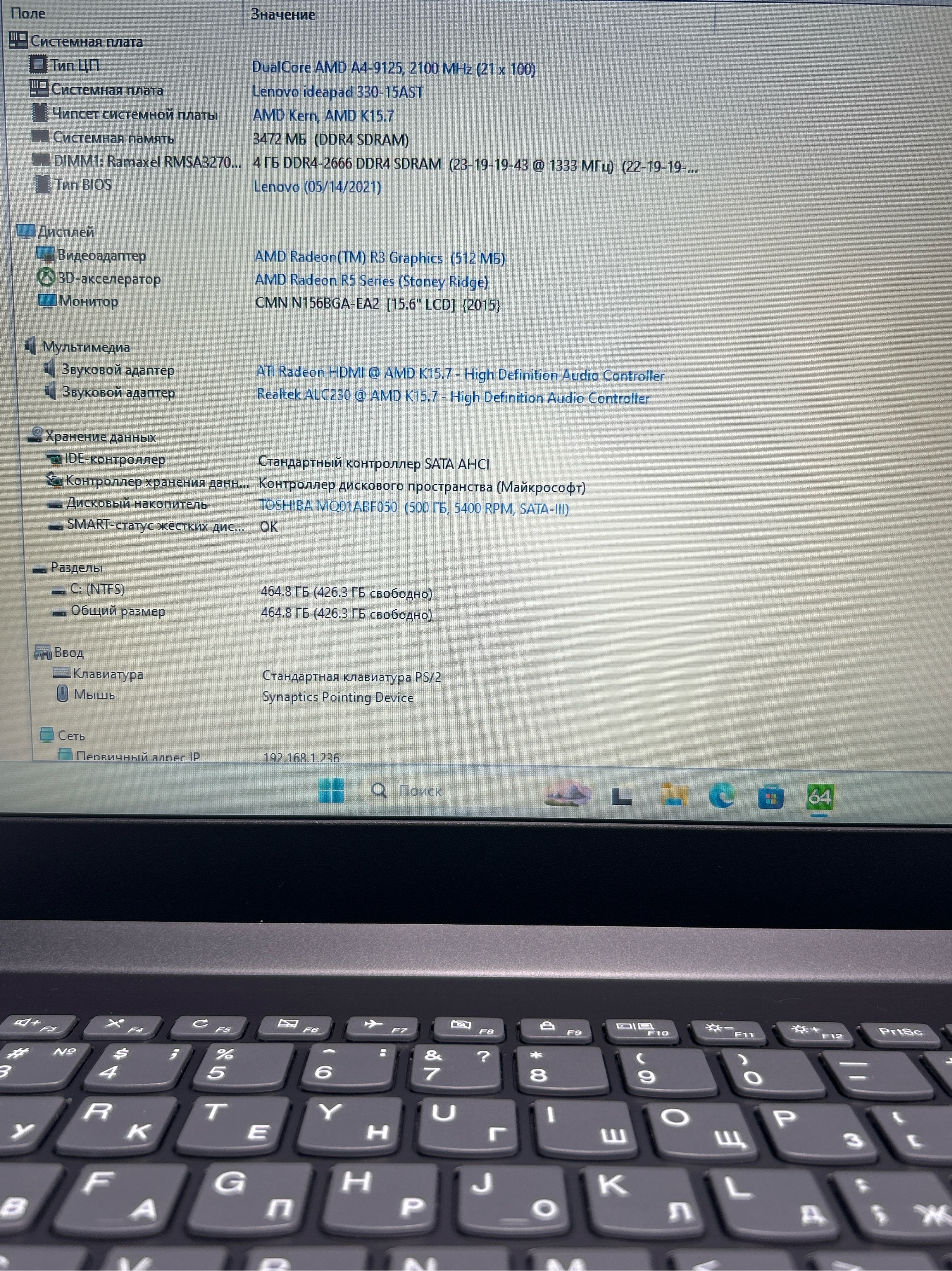 Ноутбук Lenovo IdeaPad 330-15AST (81D6002GRU) 15.6"/AMD A4 9125/RAM 4GB/HDD 500GB/AMD Radeon 530 2GB/1366*768/TN/Windows 11/Подсветка кл-ры: НЕТ/Чёрный. Состояние: C1