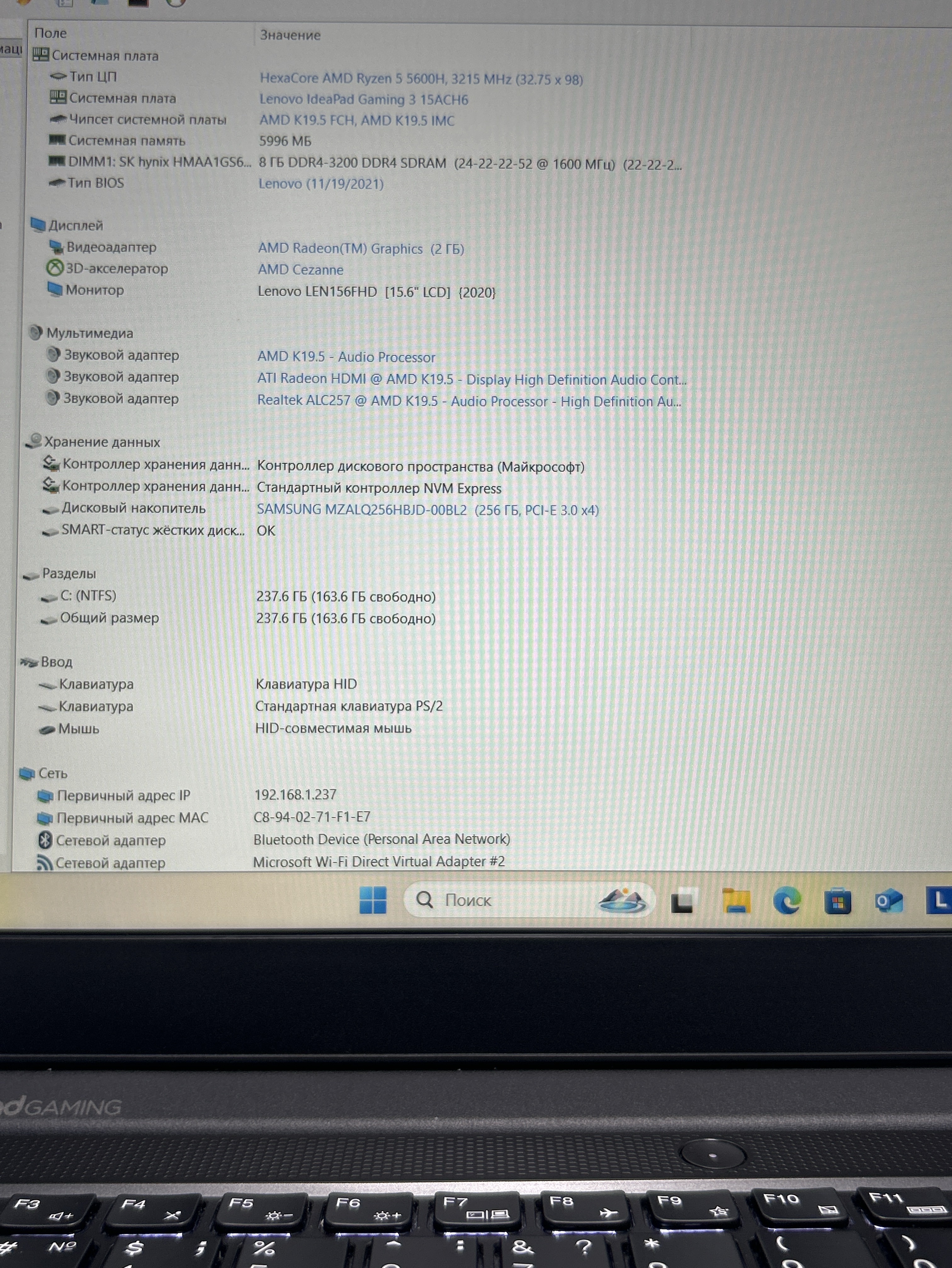 Ноутбук Lenovo IdeaPad Gaming 3 15ACH6 (82K201D1RK) 15.6"/AMD Ryzen 5 5600H/RAM 8GB/SSD 256GB/Nvidia RTX3050 4GB/1920*1080/IPS/DOS/Подсветка кл-ры: LED/Черный. Состояние: Уценка/большой след. на матрице от клавиатуры