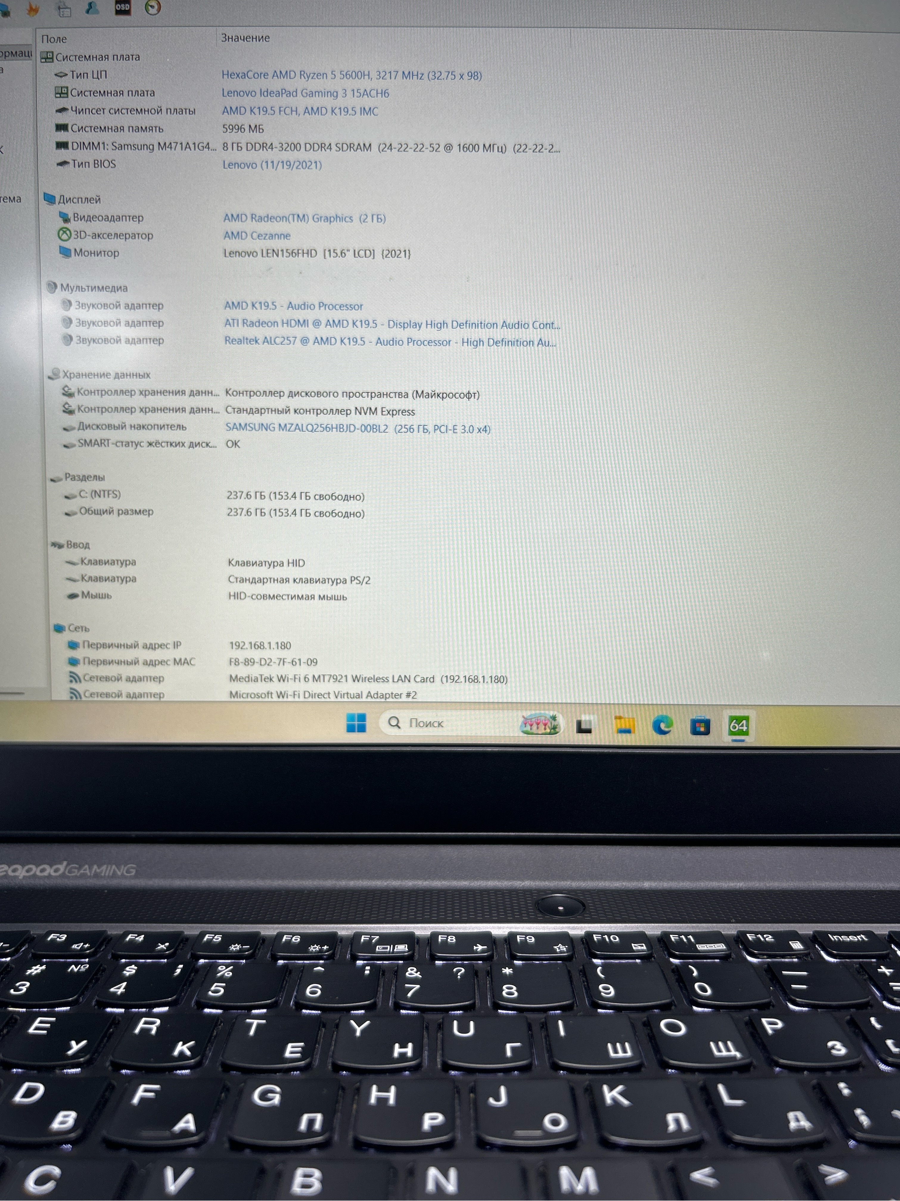 Ноутбук Lenovo IdeaPad Gaming 3 15ACH6 (82K201D1RK) 15.6"/AMD Ryzen 5 5600H/RAM 8GB/SSD 256GB/Nvidia RTX3050 4GB/1920*1080/IPS/DOS/Подсветка кл-ры: LED/Черный. Состояние: Уценка/большой след на матрице от клавиатуры/С1