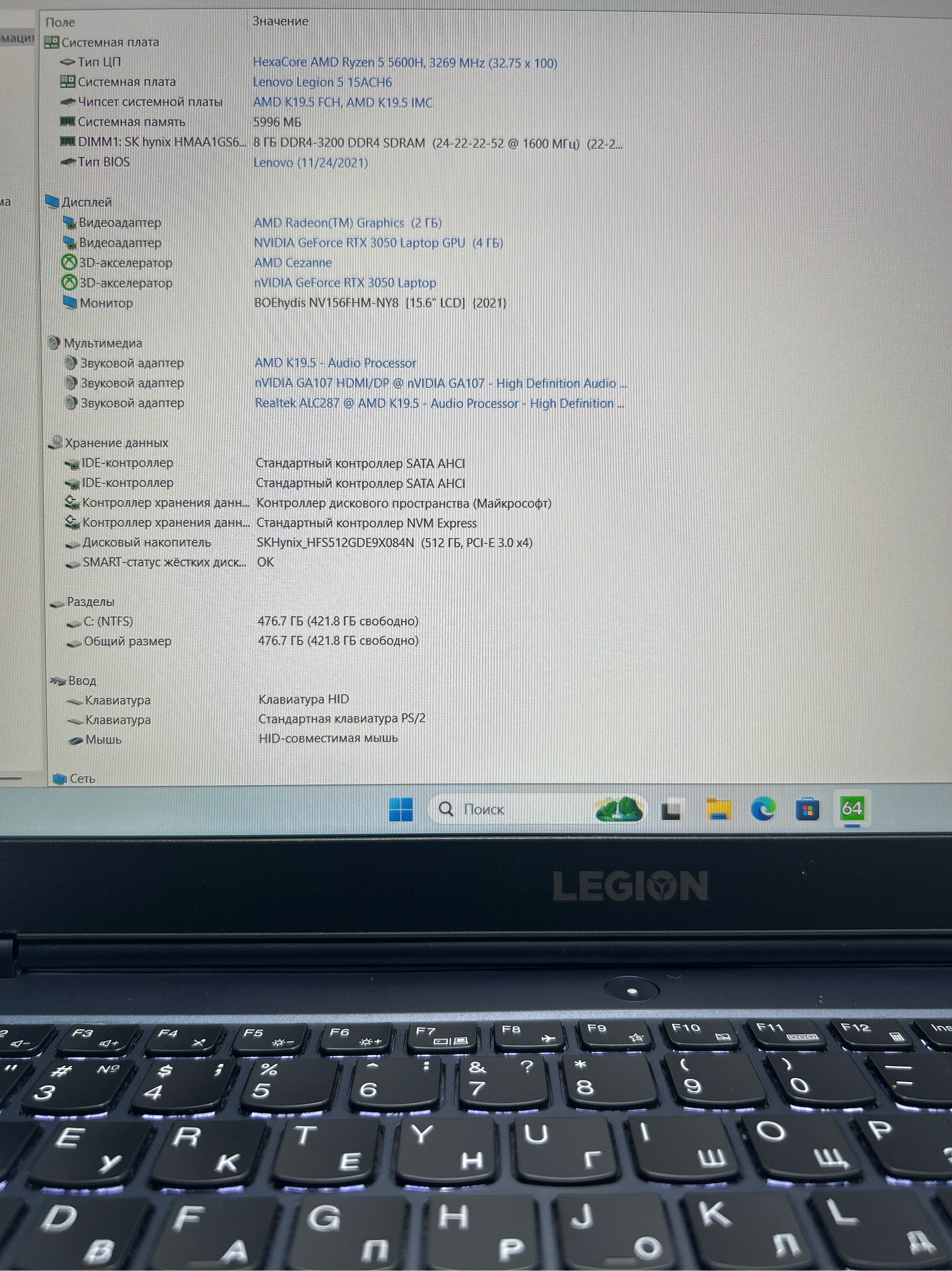 Ноутбук Lenovo Legion 5-15ACH6 (82JW00CGRU) 15.6"/ AMD Ryzen 5 5600H/RAM 8 GB/SSD 512 GB/Nvidia RTX3050 4GB/1920x1080/IPS 165 Hz/Windows 10/Подсветка кл-ры:LED/синий. Состояние: Уценка/ царапины на матрице