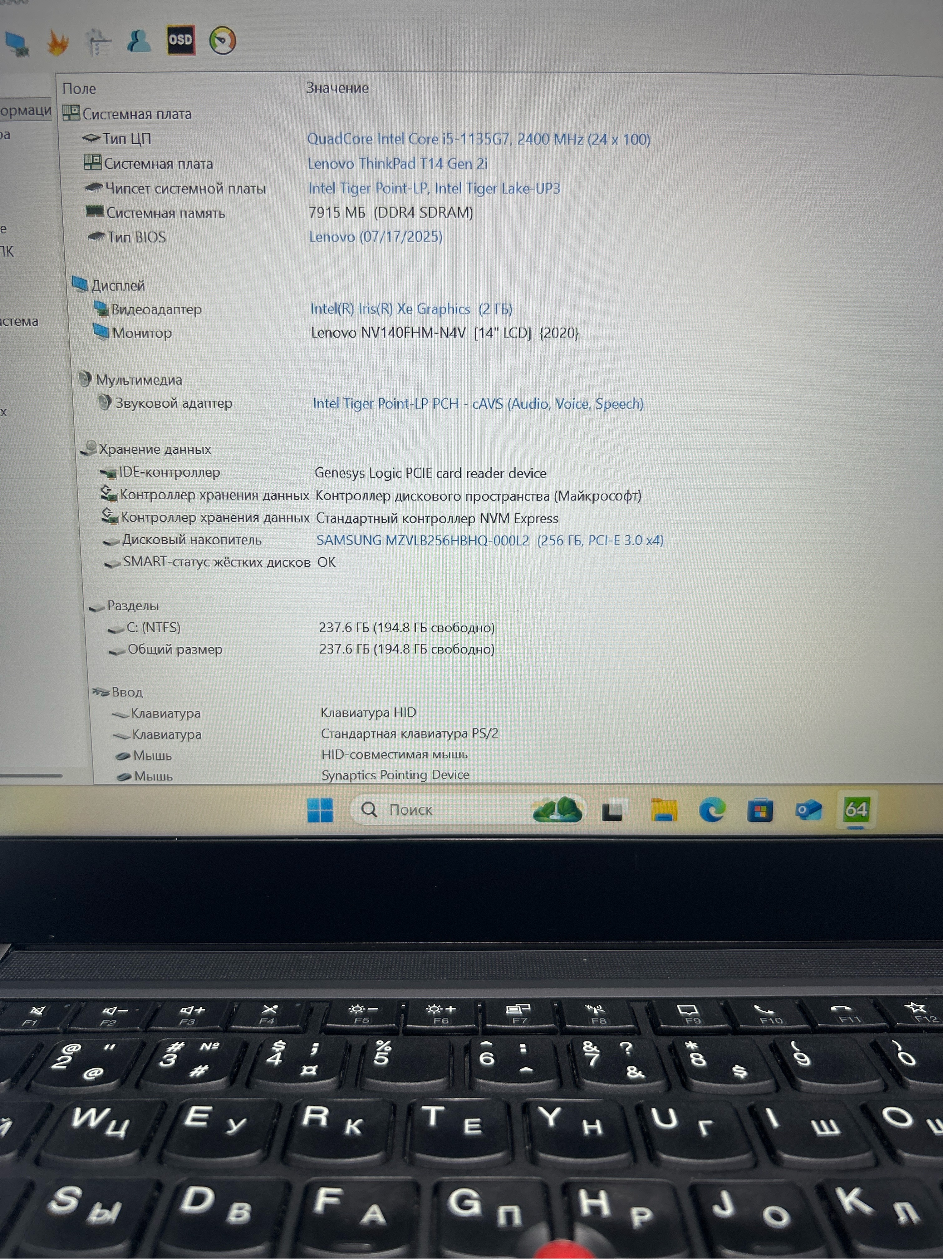 Ноутбук Lenovo T14 GEN2 14''/Intel Core i5 1135G7/RAM 8GB/SSD 256GB/Intel Iris Xe Graphics/1920x1080 IPS/Windows 11/Подсветка кл-ры: нет/Цвет: Чёрный. Состояние: Уценка/большие следы на матрице от клавиатуры/потертости на клавиатуре