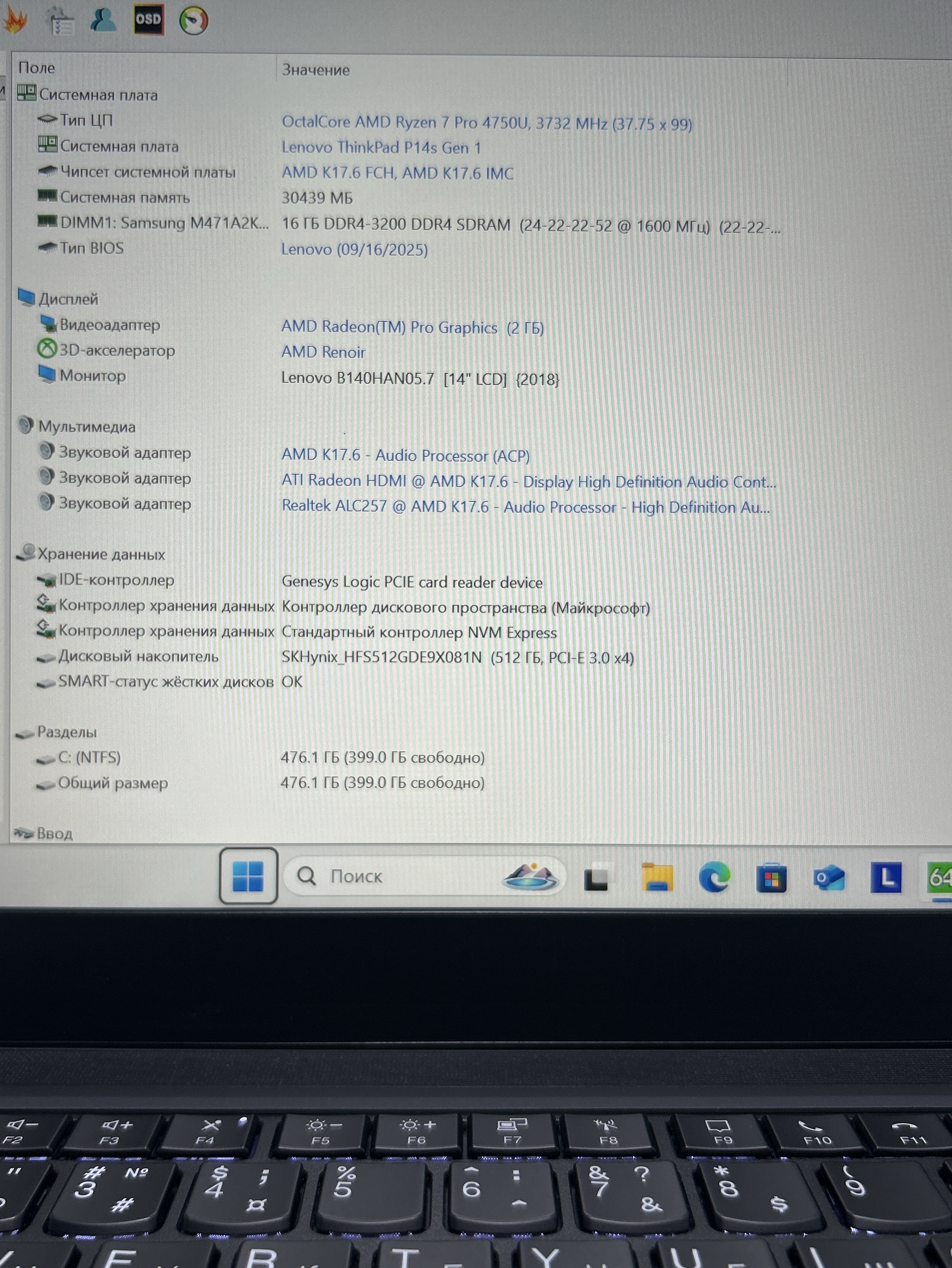 Ноутбук Lenovo ThinkPad P14s Gen 1 (20Y10038RT)14"/AMD Ryzen 7 Pro 4750U/RAM 32 GB/SSD 512 GB/AMD Radeon Vega/1920x1080/IPS/Windows 11/Подсветка - кл: LED/Черный. Состояние: Уценка/небольшой след. на матрице от клавиатуры