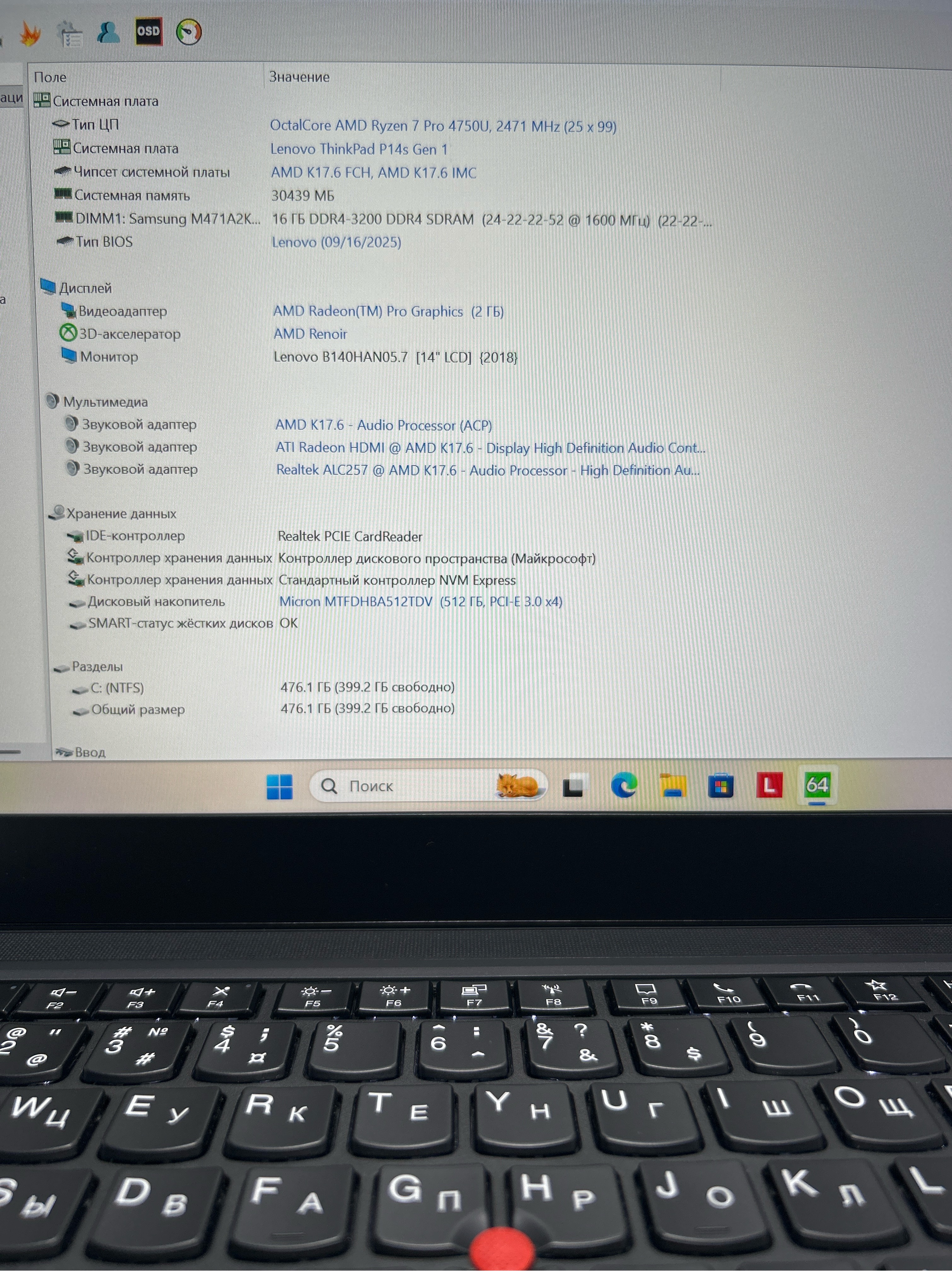 Ноутбук Lenovo ThinkPad P14s Gen 1 (20Y10038RT)14"/AMD Ryzen 7 Pro 4750U/RAM 32 GB/SSD 512 GB/AMD Radeon Vega/1920x1080/IPS/Windows 11/Подсветка - кл: LED/Черный. Состояние: Уценка/небольшой след на матрице от клавиатуры/B1