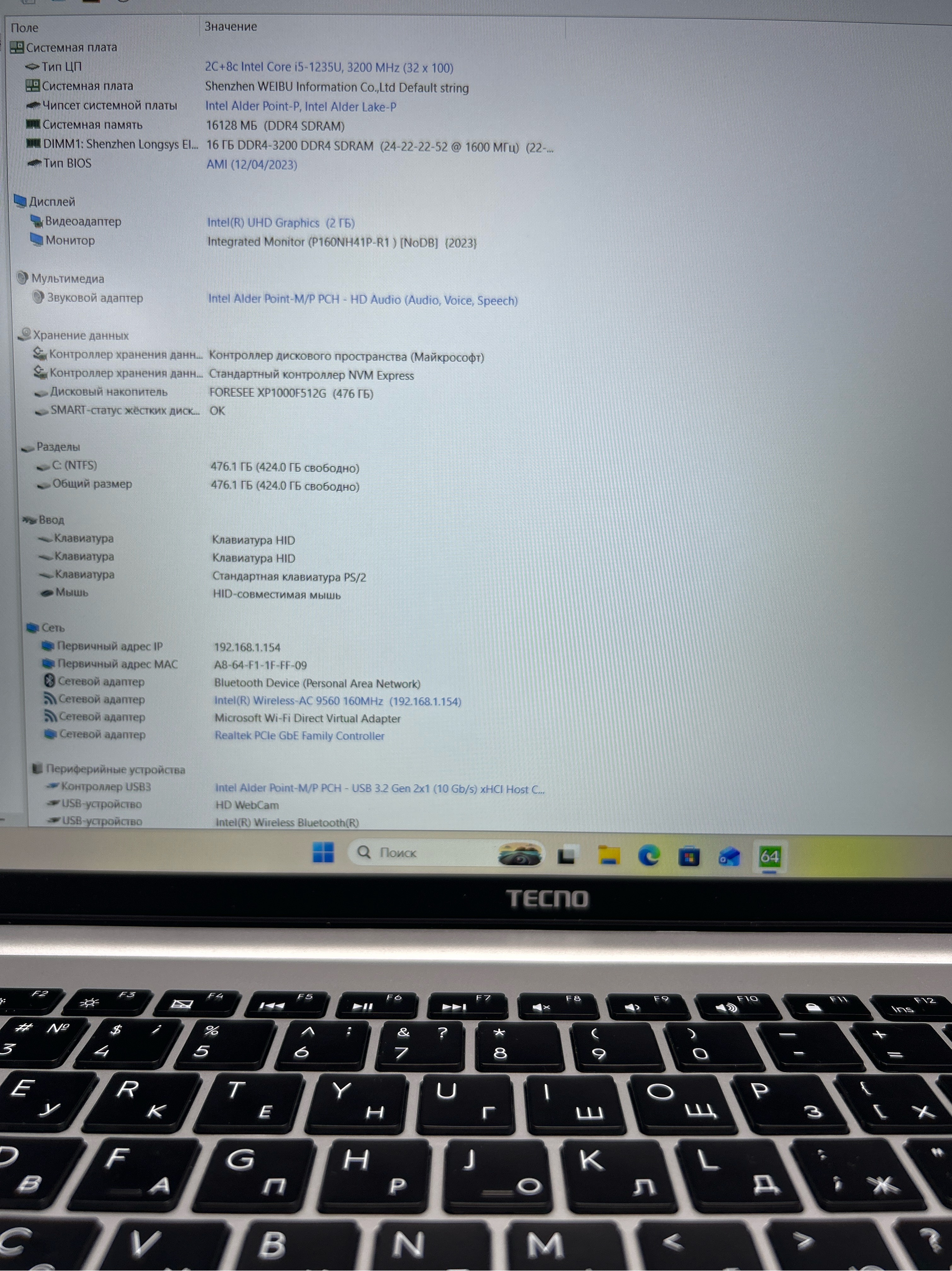 Ноутбук Tecno MegaBook K16AS 16"/Intel Core i5-1235U/RAM 16GB/SSD 512GB/Intel UHD Graphics/1920x1080/IPS/Windows 11/Подсветка - кл:LED/Cерый космос. Состояние: A1