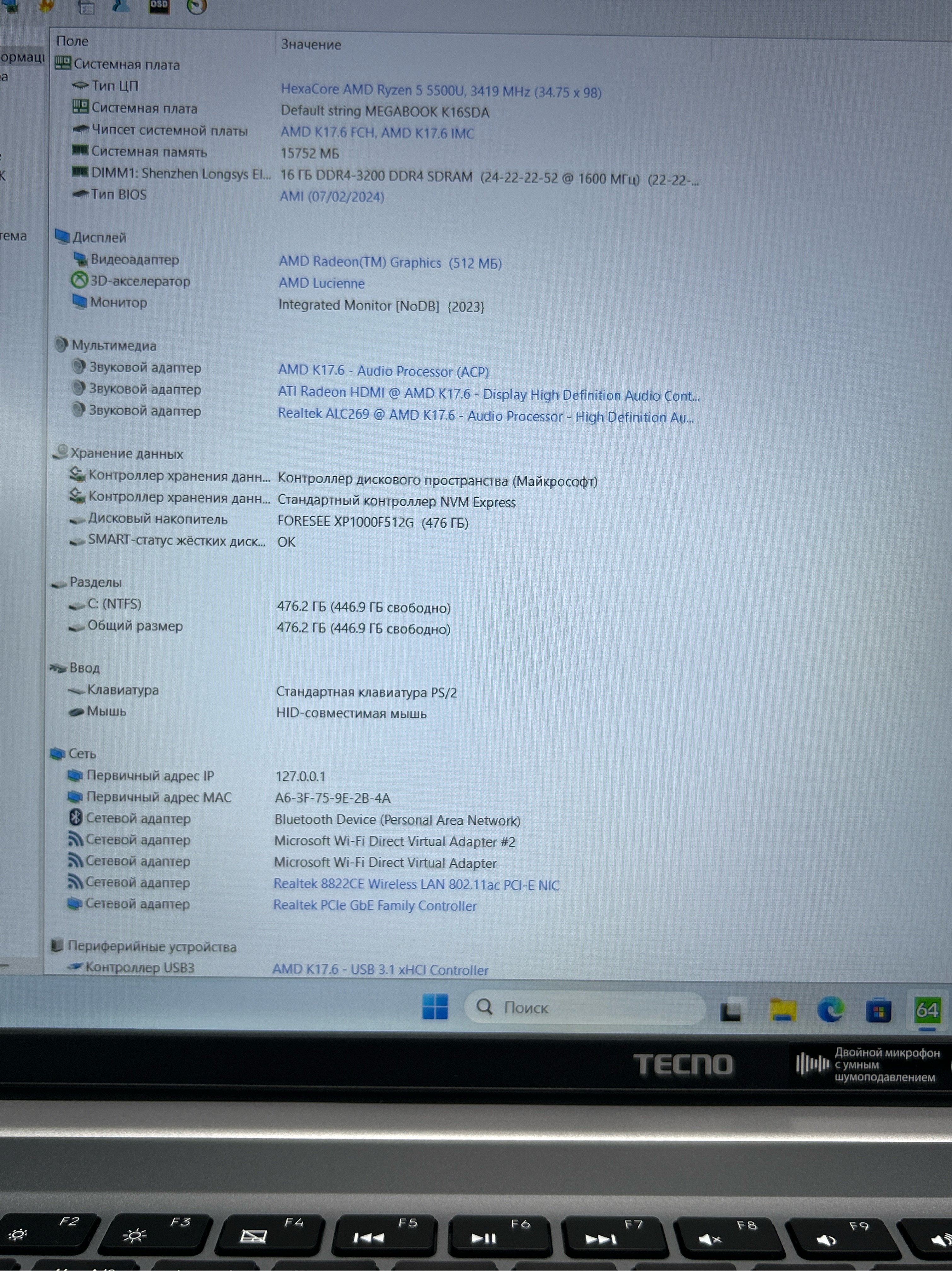 Ноутбук Tecno MegaBook K16SDA 16"/AMD Ryzen 5 5500U/RAM 16GB/SSD 512GB/AMD Radeon Graphics/1920x1080/IPS/Windows 11/Подсветка - кл:нет/Cерый космос. Состояние: B1