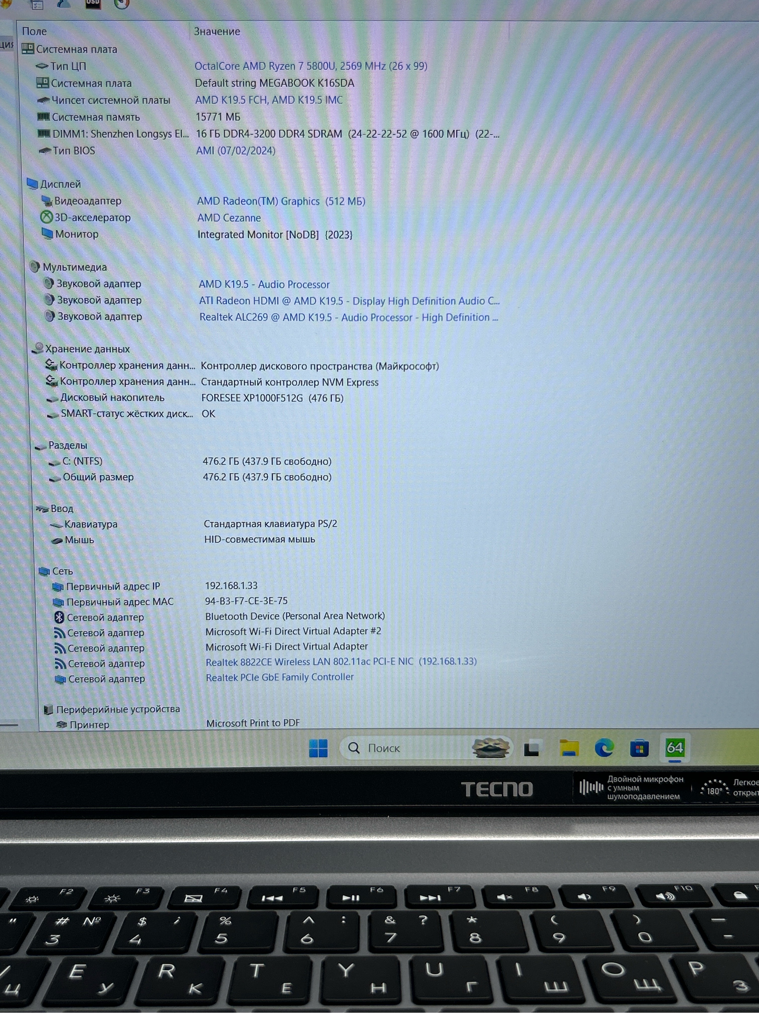Ноутбук Tecno MegaBook K16SDA 16"/AMD Ryzen 7-5800U/RAM 16GB/SSD 512GB/AMD Radeon Graphics/1920x1080/IPS/Windows 11/Подсветка - кл:нет/Cерый космос. Состояние: B1