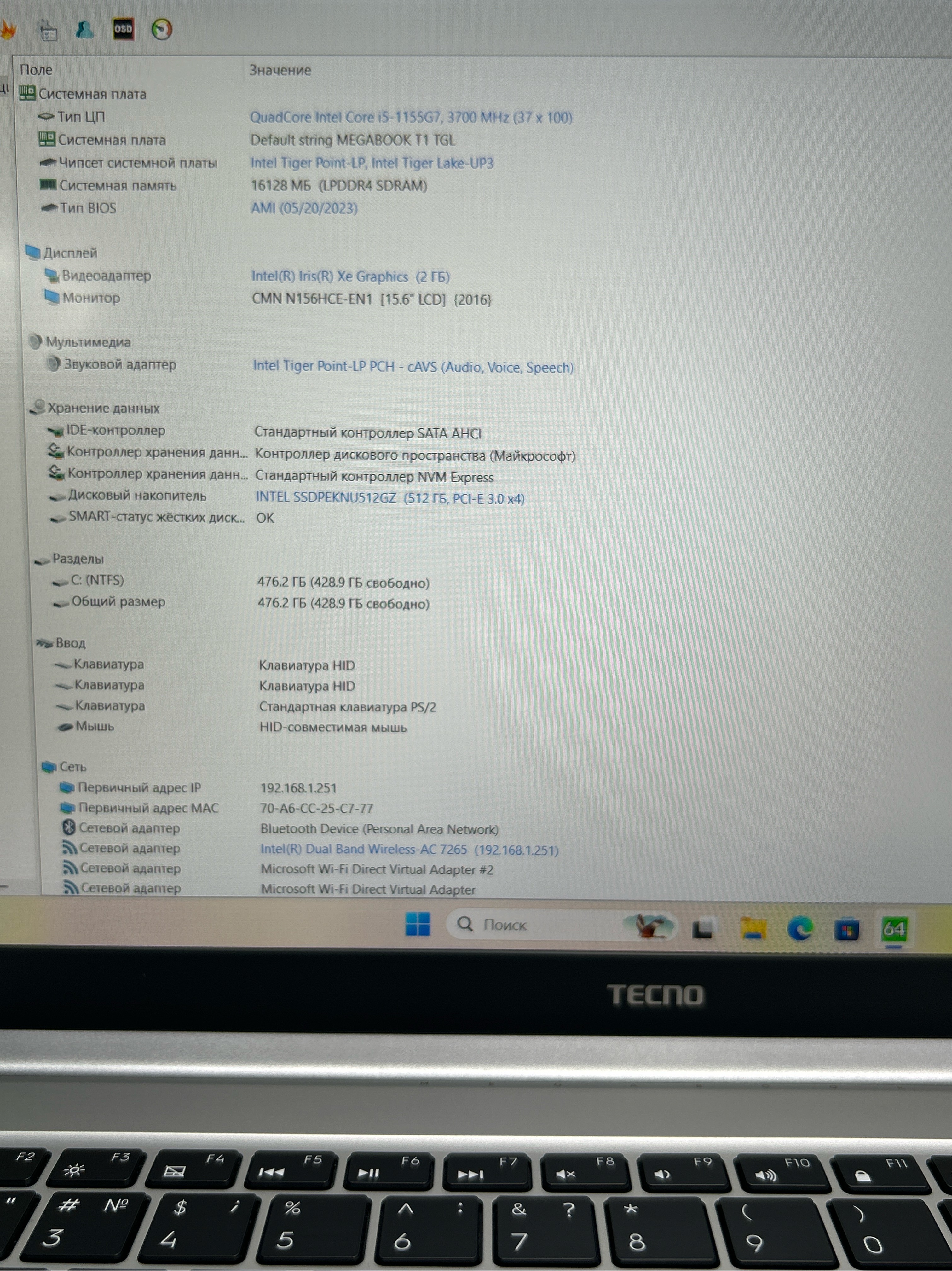 Ноутбук Tecno MEGABOOK T1(4894947003905) 15.6"/Intel i5-1155G7/RAM 16 GB/SSD 512 GB/Intel Iris Xe graphics/1920x1080/IPS/DOS/Подсветка - кл:LED/Cеребристый. Состояние: C1